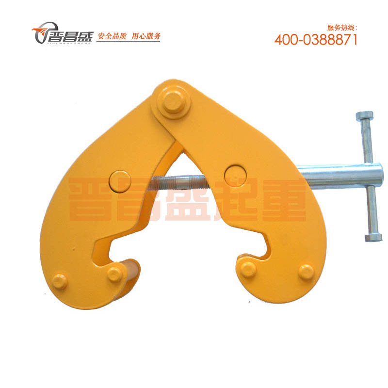 固定于螺紋鋼上支撐和起吊葫蘆設備,載荷范圍0-5噸; 采用低碳優(yōu)質(zhì)合金鋼制造以一只為實(shí)驗額定載荷,試驗載葆為2倍最大工作載荷。 逆時(shí)針旋螺紋軸,松開(kāi)鉗口,夾入工字鋼下緣,順時(shí)針旋螺紋軸,夾緊即可。